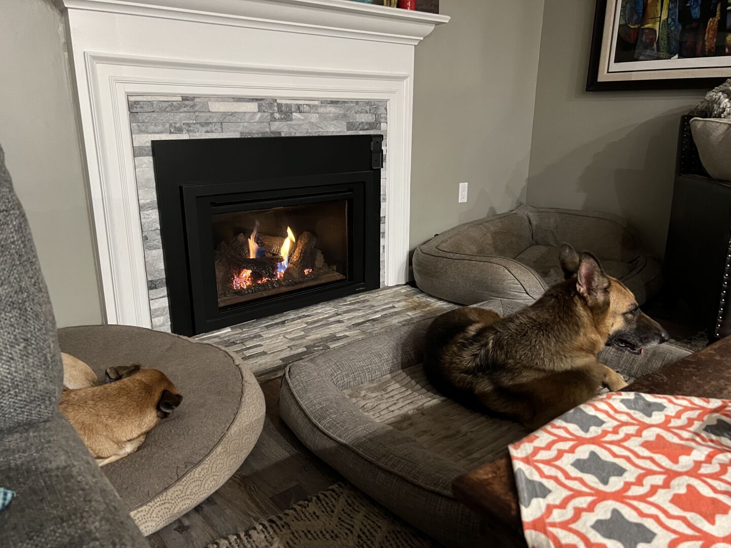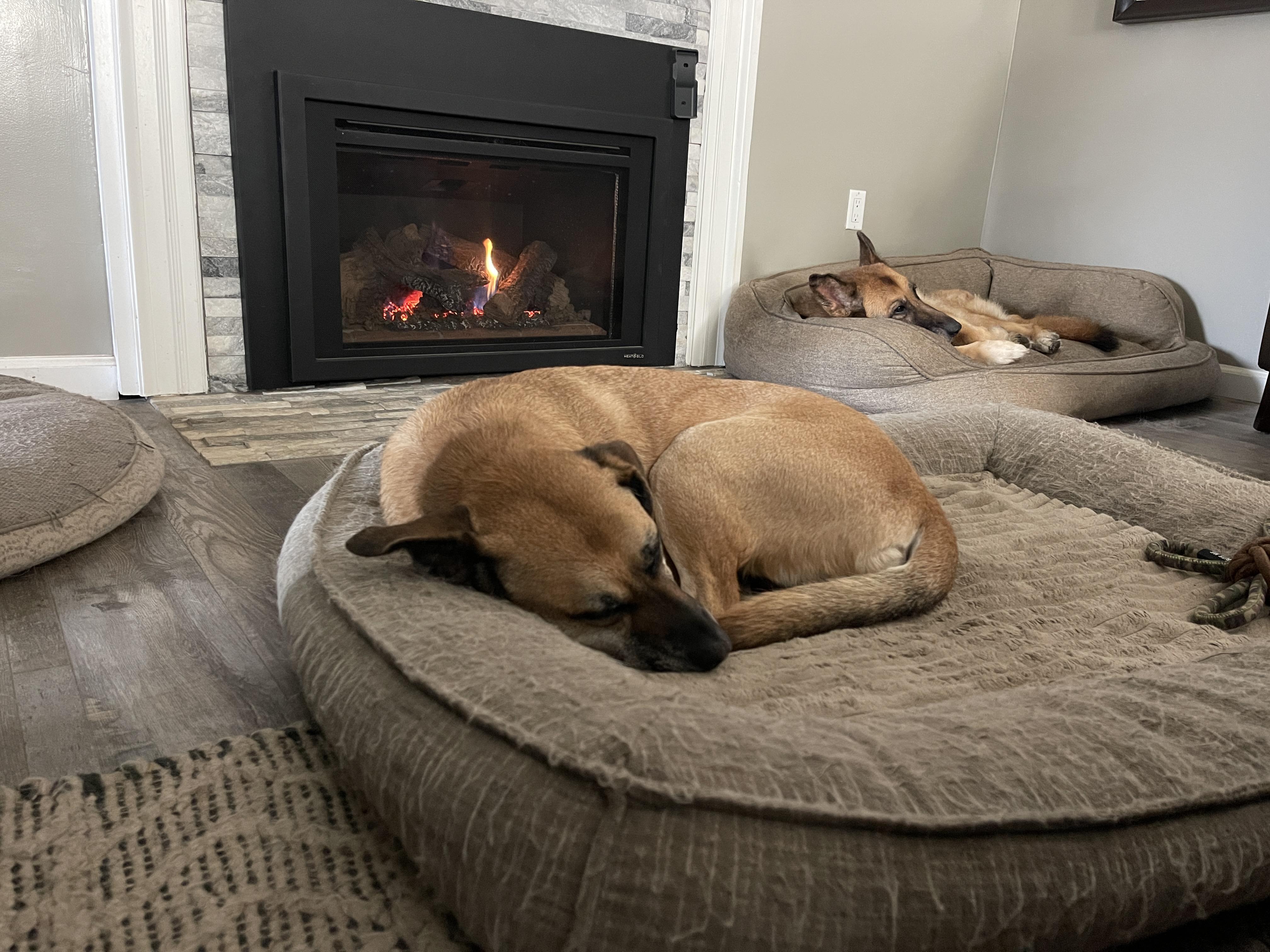 This is an image of two dogs sleeping on dog beds near a fireplace. The dogs are keeping warm by the fire.