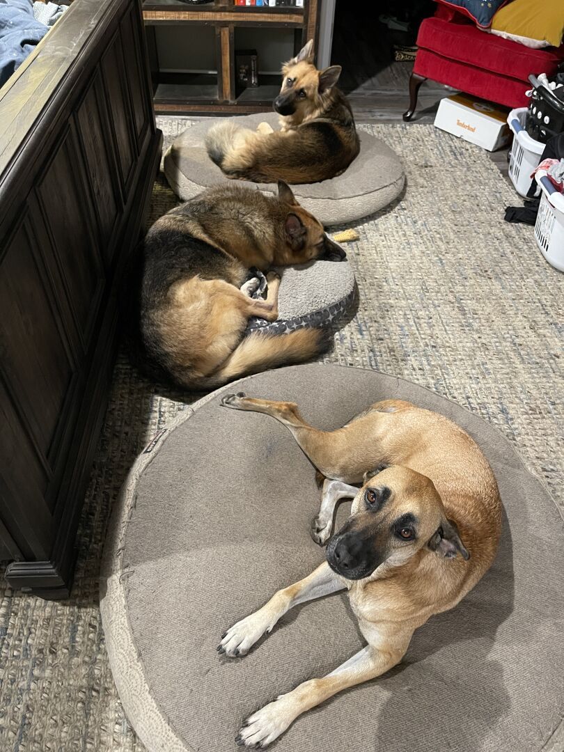 Three dogs laying on three separate dog beds. The largest dog is laying on the smallest of the three beds in the middle.