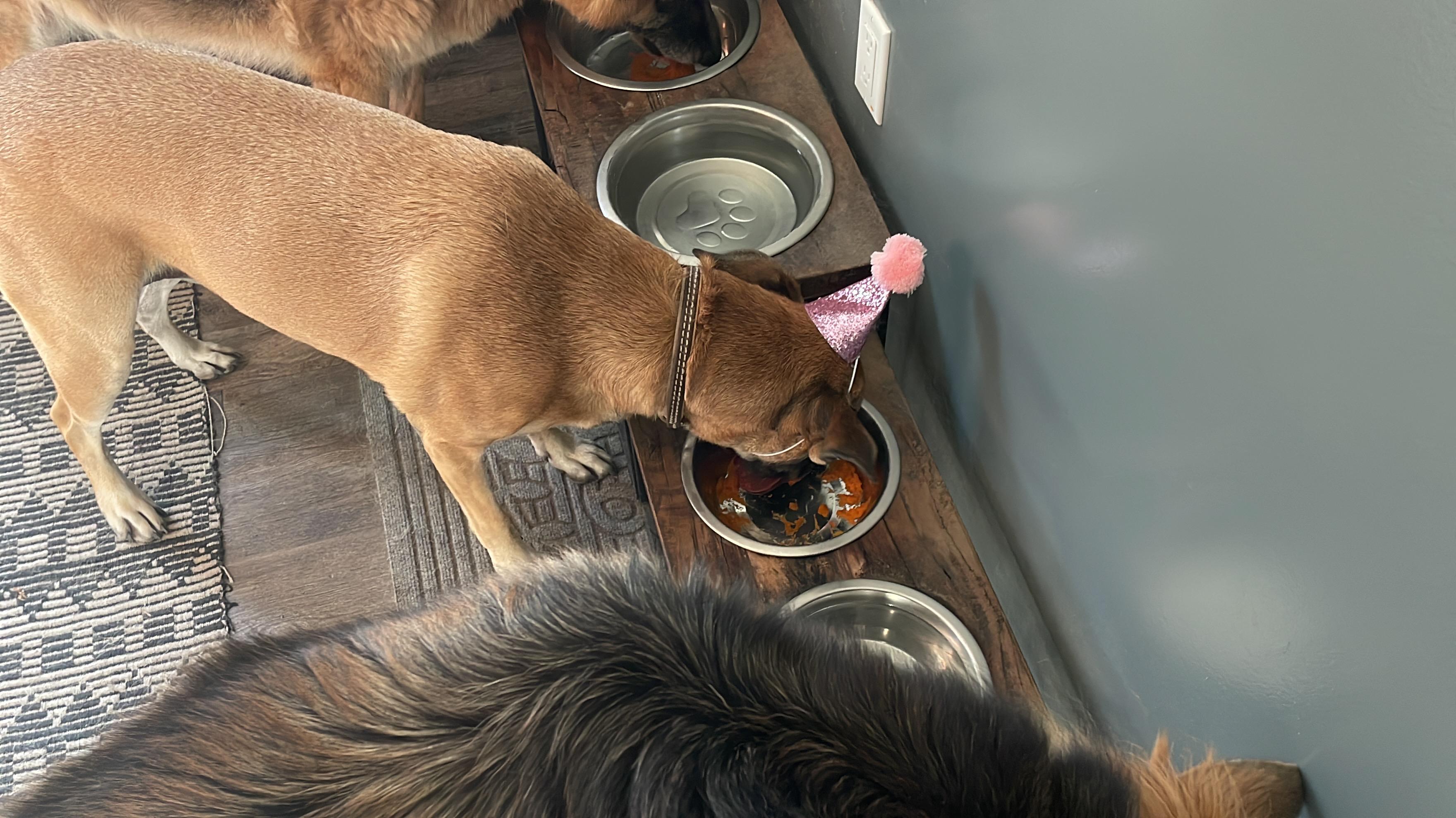 Giving the dogs a special treat of canned pumpkin to celebrate Nola's 7th birthday.