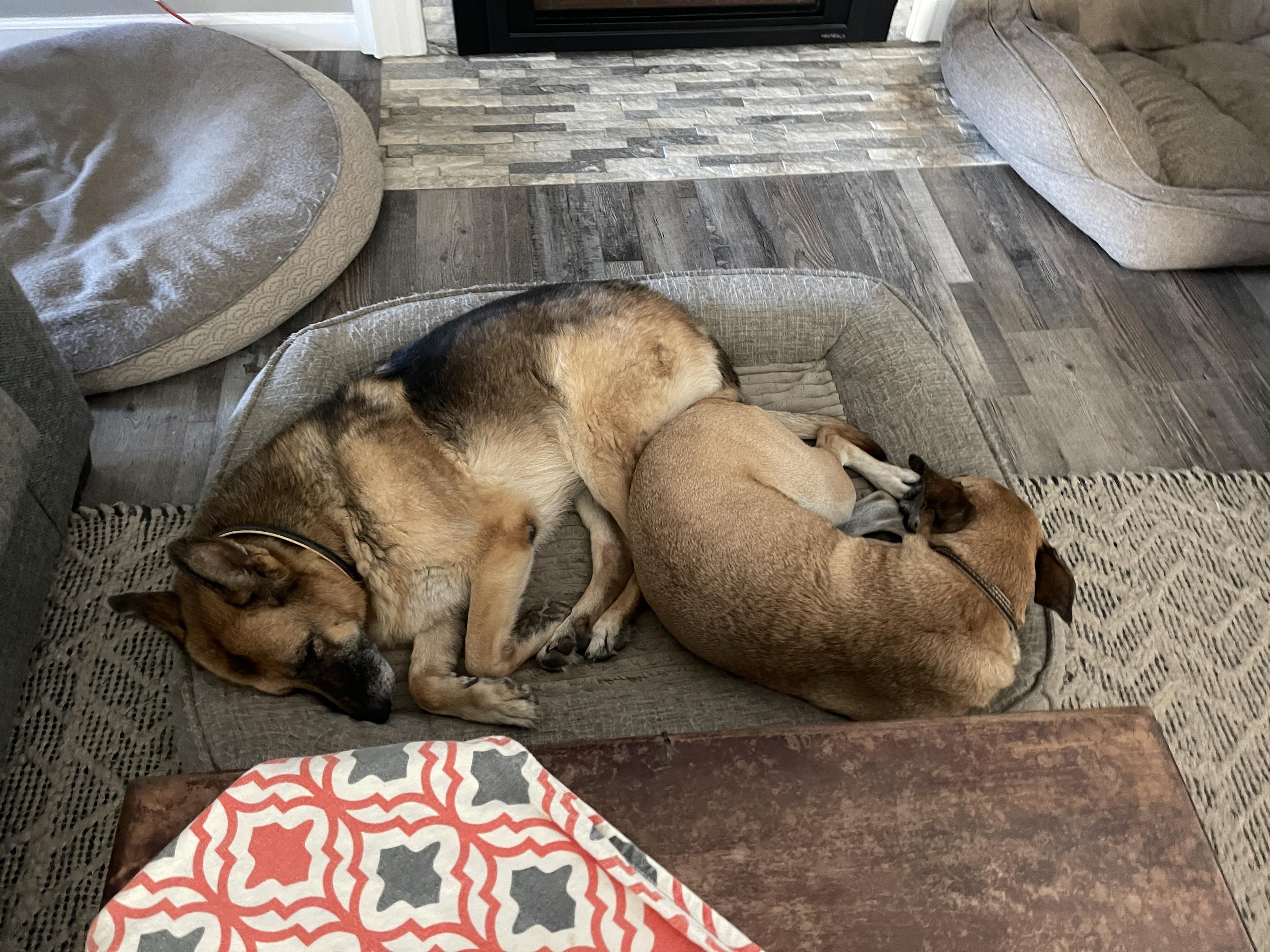 Two dogs are sleeping on the same dog bed when there are two more empty dog beds visible in the image. The dog on the left is a German Shepherd Dog. The dog on the right is a Black Mouth Cur
