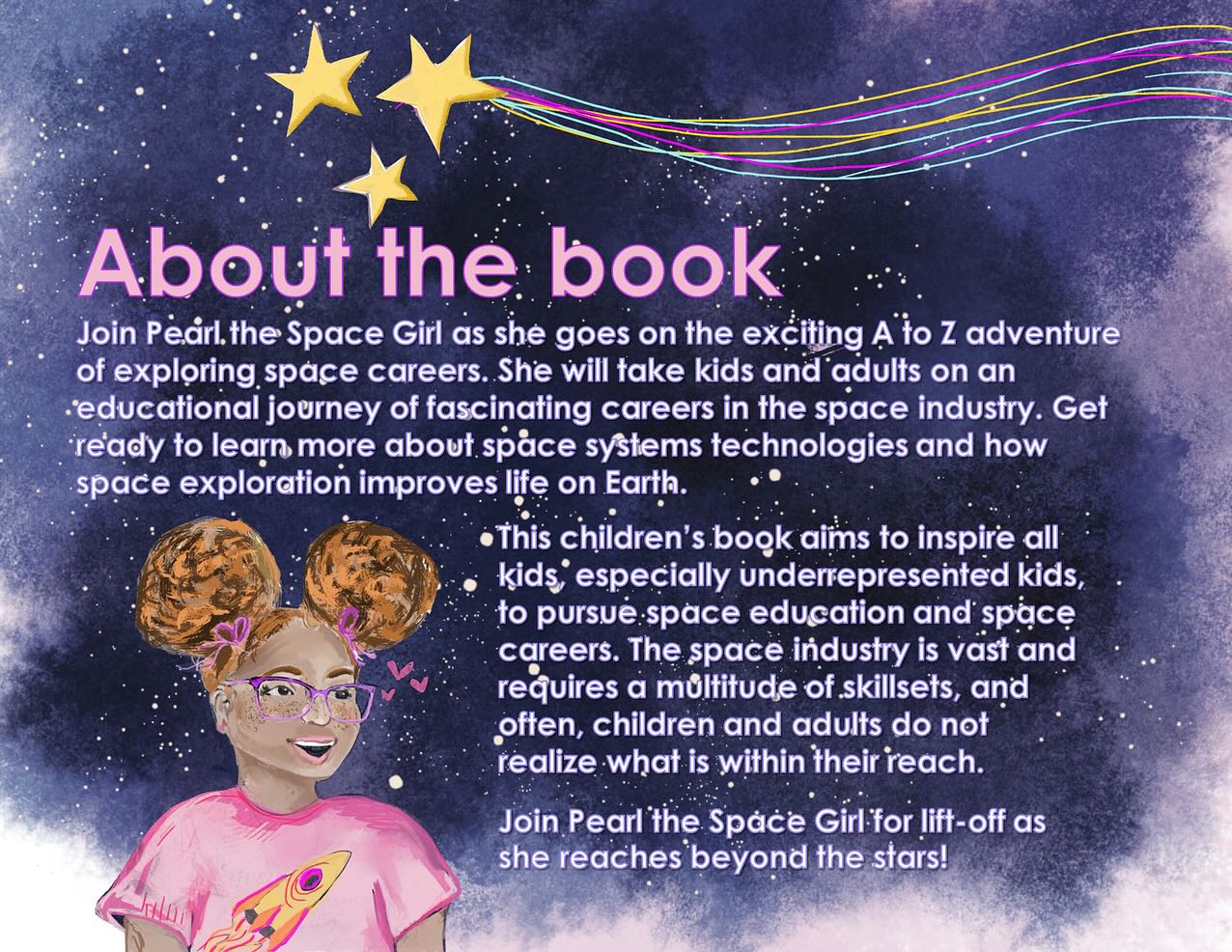 The back cover of the book is artwork of a girl wearing a pink shirt with a rocket on it. About the book. Join Pearl the Space girl as she goes on the exciting A to Z adventure of exploring space careers. She will take kids and adults on an educational journey of fascinating careers in the space industry. Get ready to learn more about space systems technologies and how space exploration improves life on earth. This children's book aims to inspire all kids, especially underrepresented kids, to pursue space education and space careers. The space industry is vast and requires a multitude of skillsets, and often, children and adults do not realize what is within their reach. Join Pearl the Space girl for lift-off as she reaches beyond the stars!